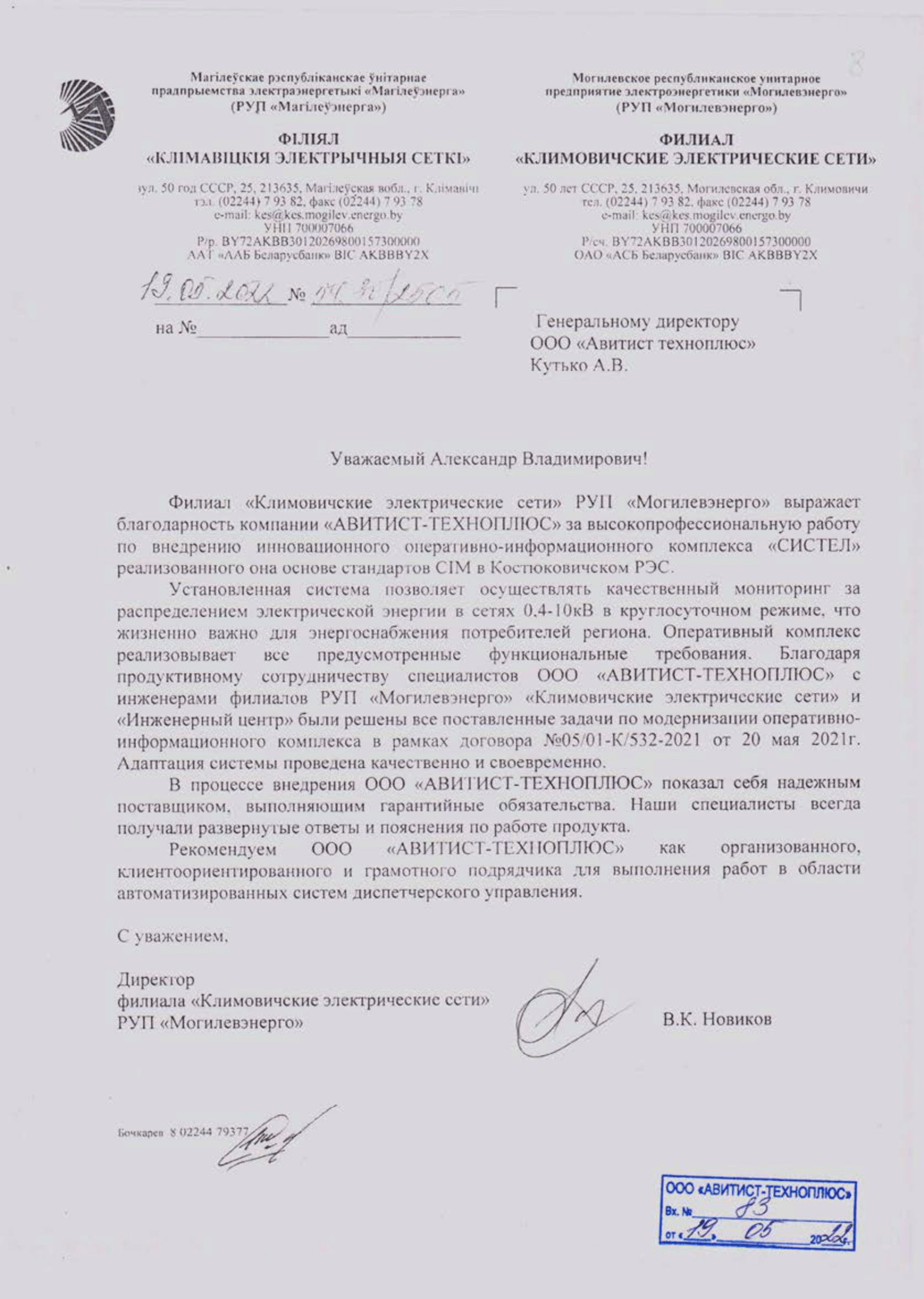 Филиал «Климовичские электрические сети» РУП «Могилевэнерго» выражает благодарность компании «АВИТИСТ-ТЕХНОПЛЮС» за высокопрофессиональную работу по внедрению инновационного оперативно-информационного комплекса «СИСТЕЛ» реализованного она основе стандартов CIM в Костюковичском РЭС.
